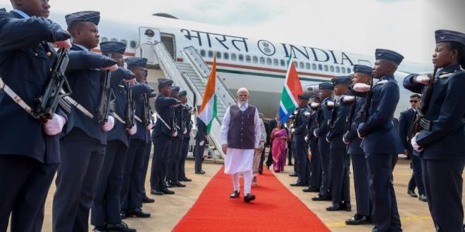 प्रधानमंत्री नरेन्द्र मोदी दक्षिण अफ्रीका की अध्यक्षता में हो रहे जी-20 नेताओं के शिखर सम्मेलन में हिस्सा लेने के लिए शुक्रवार को जोहानिसबर्ग पहुंचे. उन्होंने शिखर सम्मेलन से इतर विश्व नेताओं के साथ मुलाकात में प्रमुख वैश्विक मुद्दों पर “सार्थक चर्चा” होने की उम्मीद जताई. मोदी गौतेंग स्थित वाटरलूफ वायुसैनिक अड्डे (एएफबी) पहुंचे, जहां उनका गर्मजोशी से स्वागत किया गया. दक्षिण अफ्रीकी वायु सेना की ओर से उन्हें रेड कार्पेट पर सलामी दी गई.